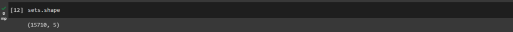 Például, ha a sets.shape értéke (15710, 5), az azt jelenti, hogy a DataFrame 15710 sorból és 5 oszlopból áll.
