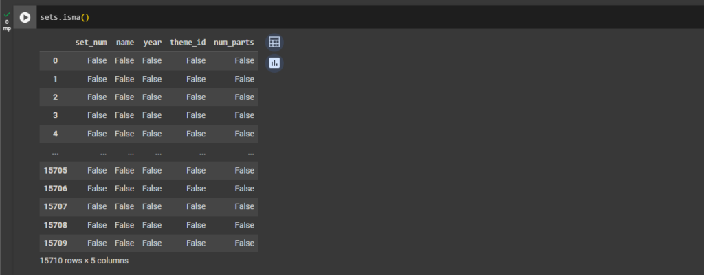 A sets.isna() a Pandas egy módszere, hogy megbizonyosodjunk róla, hogy NaN (Not a Number) van-e a DataFrame-ben.