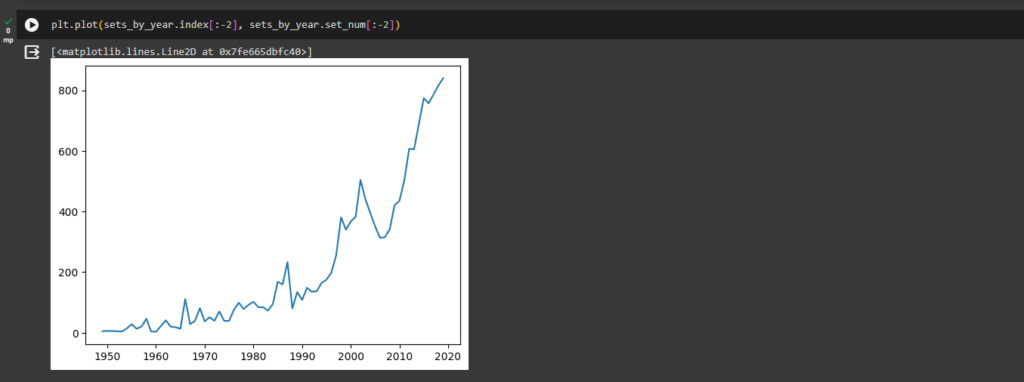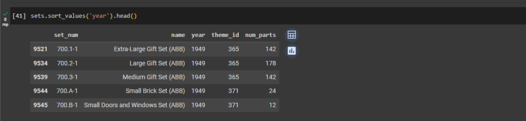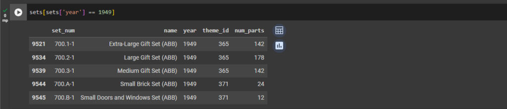 1949-ben a LEGO mindössze 5 különböző készletet árult. Itt a DataFrame szűrését egy feltétel alapján végezzük. Azokat a sorokat hívjuk le, ahol a year oszlop értéke 1949: sets[‘year’] == 1949.