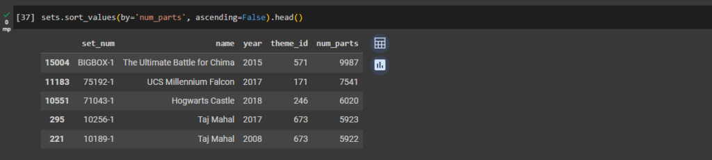 Most nézzük meg, melyik LEGO készlet tartalmazza a legtöbb darabot. Ha meg akarjuk találni a legnagyobb darabszámot, akkor a num_parts oszlop szerinti rendezésnél az ascending argumentumot False-ra kell állítanunk.