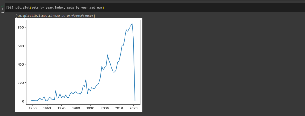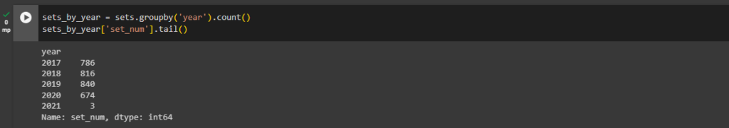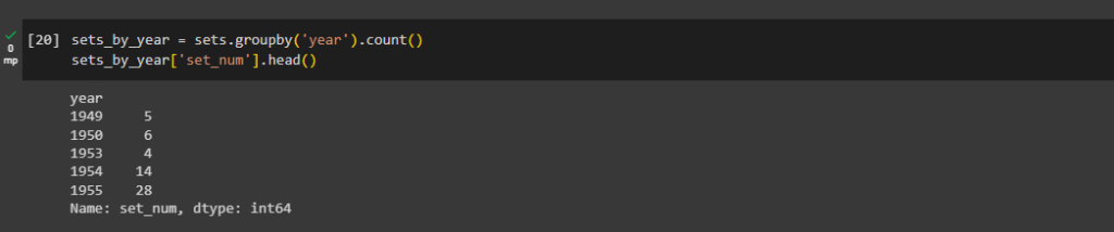 Most hozzunk létre egy új sorozatot, amelyet sets_by_year-nek nevezünk, és amelynek indexe az év, az értéke pedig az adott évben kiadott készletek száma. A folyamat, az adatok csoportosítása az év szerint, majd az adott évre vonatkozó bejegyzések számának megszámlálása.