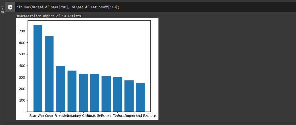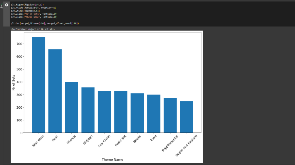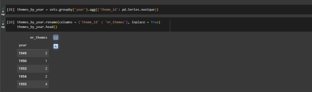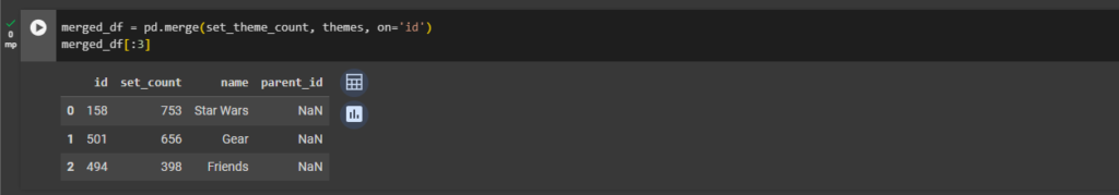 Ahhoz, hogy két DataFrame-t a .merge() függvénnyel egy adott oszlop mentén összekapcsoljunk, meg kell adnunk a két DataFrame-et, majd az oszlop nevét, amely mentén össze szeretnénk őket kapcsolni. Ezért állítjuk be az on=’id’ paramétert. A set_theme_count és a themes DataFrame-ünk is tartalmaz egy oszlopot ezzel a névvel.