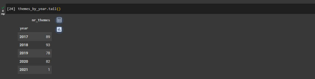 Adjunk a themes_by_year oszlopnak megfelelőbb nevet, és nézzük meg, mit kaptunk: