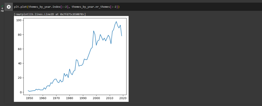 Készítsünk vonaldiagramot az évente megjelent LEGO témák számáról. Az adathalmazban csak a teljes naptári éveket (1949-től 2019-ig) vegyük figyelembe.