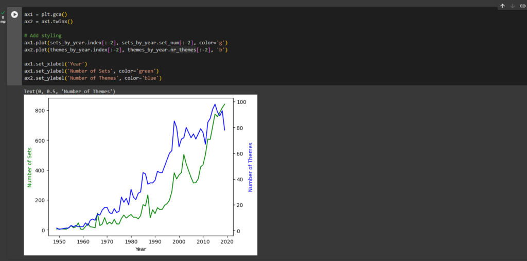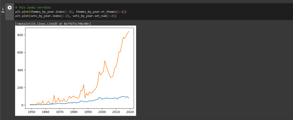Itt láthatjuk, hogy a LEGO az első néhány évben mindössze 2 témával rendelkezett, de az évek során, hasonlóan a készletek számához, a témák száma is sokszorosára nőtt. Ábrázoljuk azt újra egy diagramon.