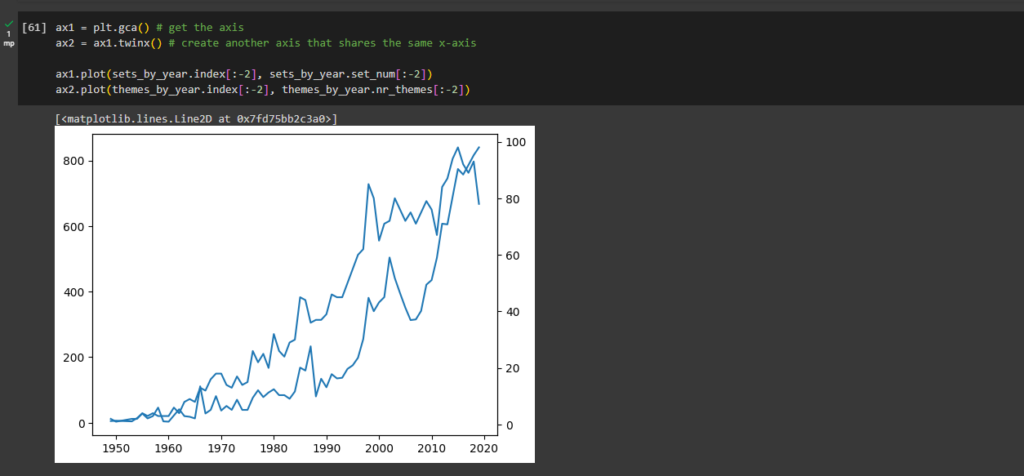 Be kell tudnunk állítani és ábrázolni az adatainkat két külön tengelyen ugyanazon a diagramon. Ehhez szükség van egy tengely objektumra a Matplotlib-ból.