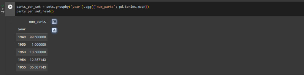 Ehhez a .groupby() és .agg() függvényeket fogjuk együtt használni. Ezúttal egy szótárat adunk át az .agg() függvénynek, hogy a num_parts oszlopra alkalmazzuk a mean() függvényt. Így az adatokat év szerint csoportosítjuk, majd kiszámítjuk az adott év készleteinek átlagos darabszámát.