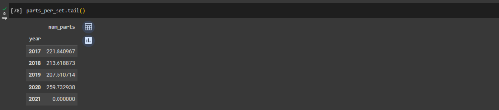 Hozzunk létre egy Pandas Series-t, amit parts_per_set-nek hívunk, és amiben az év szerepel indexként, valamint az adott évben a LEGO készletek átlagos darabszáma található.