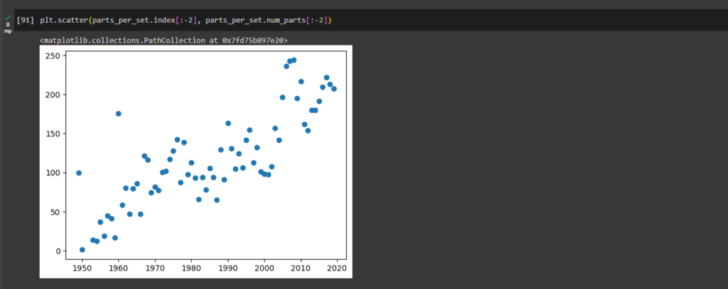 A parts_per_set adataink vizualizálásához hozzunk létre egy pontdiagramot (scatter plot). A pontdiagram egyszerűen pontokat használ az egyes adatpontok értékeinek ábrázolására.