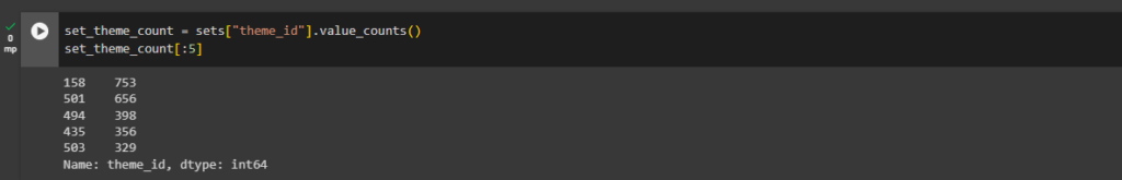 Ahhoz, hogy megszámoljuk a készletek számát témánként, használhatjuk a .value_counts() metódust a theme_id oszlopon.