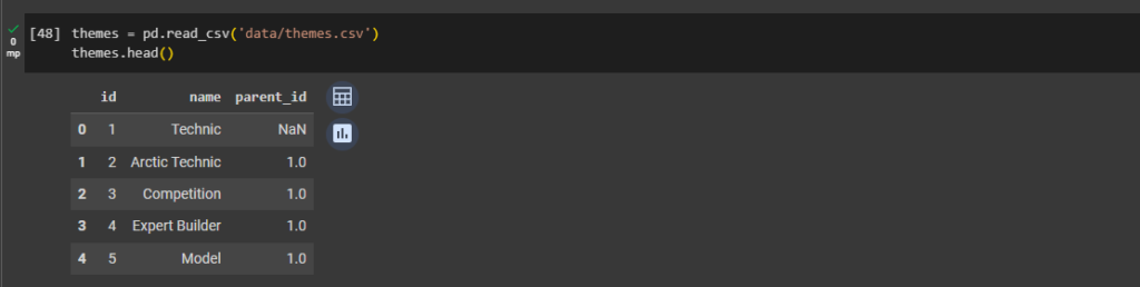 A themes.csv fájl tartalmazza a témák valódi neveit. Hogyan kapcsolódik ez a táblázat a többi táblázathoz? Nos, a sets.csv fájlban találhatóak a theme_id értékek, amelyek megegyeznek a themes.csv id oszlopának értékeivel.