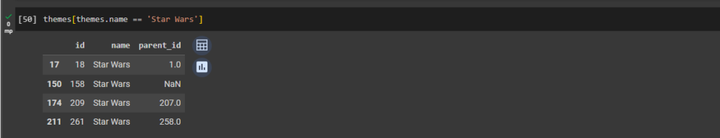Keressük meg a “Star Wars” nevű témát. Hány id tartozik a themes.csv-ben a “Star Wars” névhez?