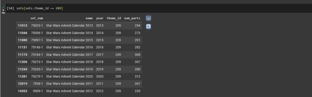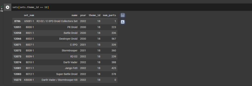 Használjuk az imént talált id-ket, és keressük meg a hozzájuk tartozó készleteket a sets.csv-ben (a theme_id oszlopban kell keresnünk az egyezéseket).