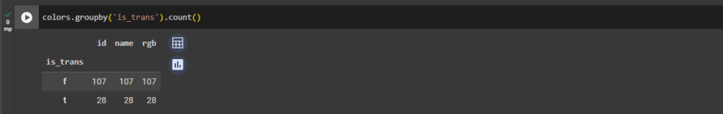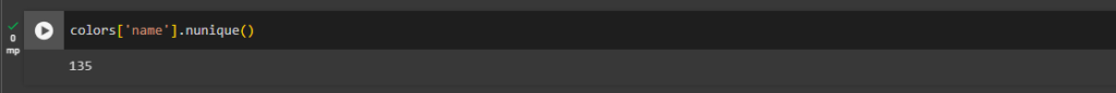 Öt oszlop van, amelyek tartalmazzák a színek neveit és azoknak megfelelő RGB értékeit. Hány különböző színt gyárt a LEGO cég? Az egyedi színek számának meghatározásához mindössze annyit kell tennünk, hogy ellenőrizzük, hogy minden bejegyzés a név oszlopban egyedi-e.
